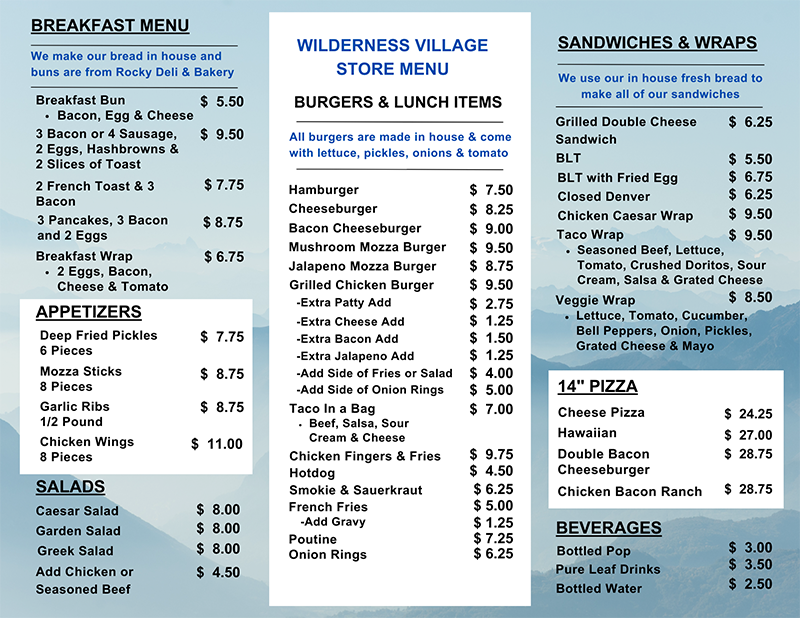 No need to worry if you forgot anything! Come visit us at the Village Eats & General Store for all your needs. We sell camping items, RV parts, local art, toiletries, off-sales, convenience items, groceries, gifts, home-made birthday cakes, party platters, bakery items, concession foods and ice cream.